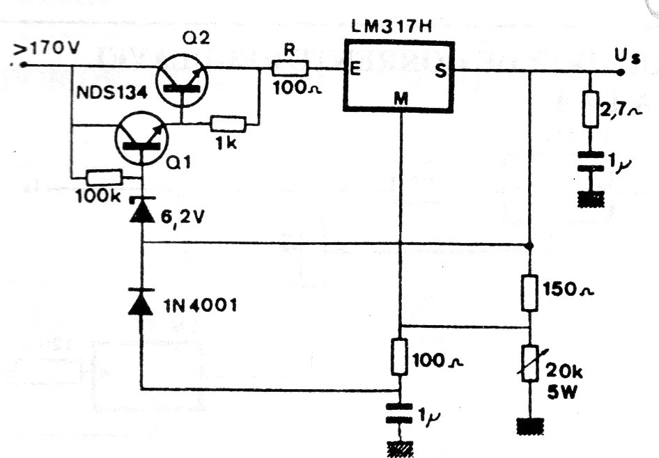 Este circuito regulador es para entradas de alta tensión haciendo su reducción inicial de modo que un regulador integrado común pueda ser utilizado. Este circuito es utilizando transistores de alta tensión no muy comunes actualmente, pero que pueden ser sustituidos por equivalentes. Los circuitos integrados y Q2 deben montarse en disipadores de calor.
