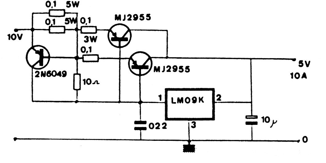 Este regulador de alta corriente para circuitos TTL fue encontrado en una antigua documentación francesa de los años 70. Aparece en otras versiones en el sitio, provenientes de otras fuentes. Los transistores de potencia deben estar dotados de disipadores y el CI admite equivalente como los 7805.