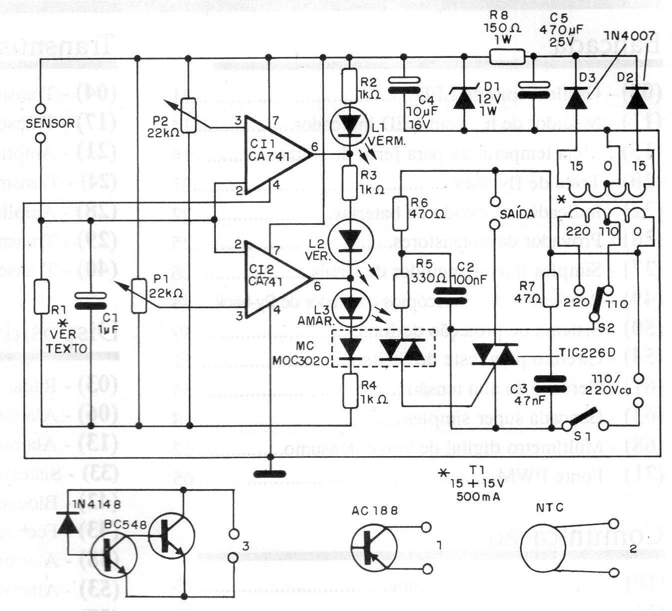 Este circuito es de una documentación antigua de 1995, pero puede ser montado con facilidad aún hoy por los componentes que usa. R1 puede ser un sensor de 220k, NTC de 220 k, o aún de 10k. El circuito controla directamente un triac que depende de la potencia del elemento de calentamiento. El triac debe montarse en un radiador de calor.