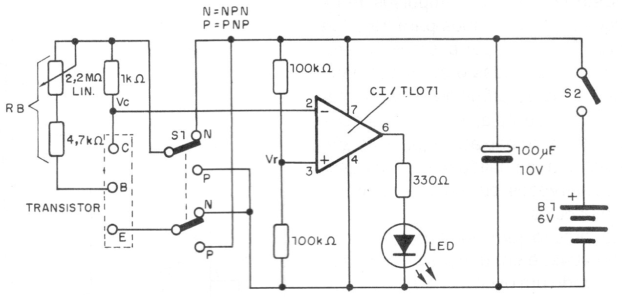 Este circuito fue encontrado en una documentación de 1995 y es muy sencillo de montar, ya que los componentes son comunes. Se prueba los transistores NPN y PNP y la ganancia se mide por la transición del LED, según su valor dado en la tabla.