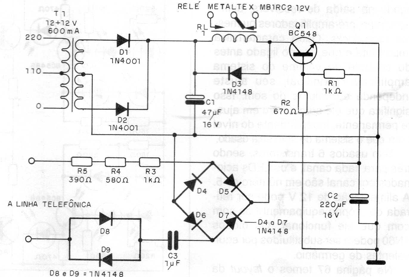 Este circuito acciona un relé cuando el teléfono suena permitiendo el control de una lámpara de advertencia o una cigarra mucho más potente que el toque normal del teléfono. El circuito utiliza un relé sensible de 12 V y la carga alimentada depende de sus contactos.