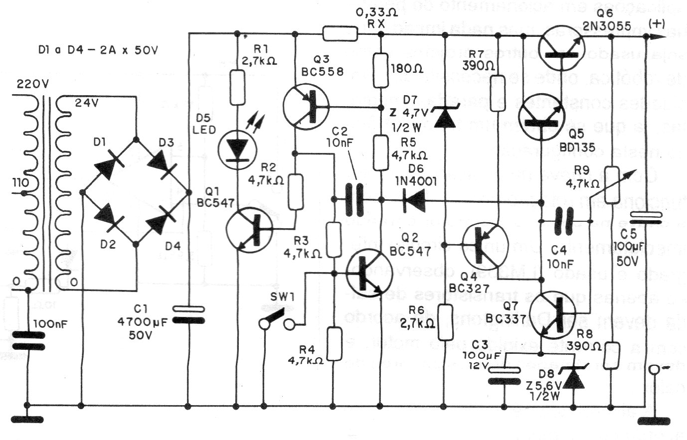 La corriente máxima de esta fuente es de 2 A y la tensión de salida puede ajustarse entre 6 y 24 V. El circuito es de una publicación de 1994 y el transistor de potencia debe estar dotado de un disipador de calor. La fuente utiliza sólo transistores y el transformador es de 24 V con 2 A de corriente. El circuito cuenta con protección contra cortocircuito ajustado en R9.