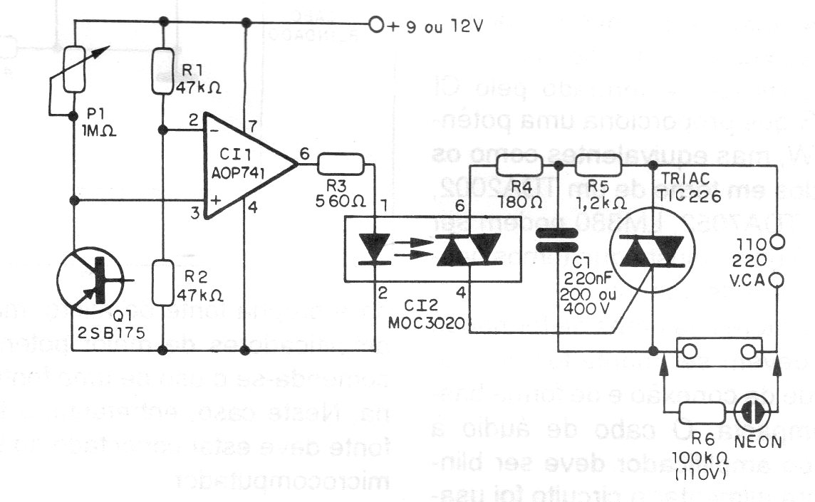El sensor de este circuito es un transistor común y el punto de disparo se ajusta en el trimpot o el potenciómetro. El circuito tiene fuente aislada para el sensor y el control del triac se hace vía opto-diac con total aislamiento. El triac debe montarse en un disipador de calor.