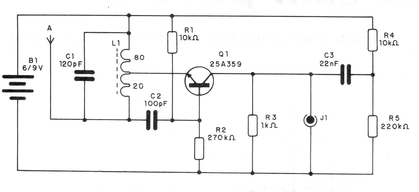 Este pequeño transmisor de AM emite sus señales a una distancia de algunos metros, según la antena. Esta antena puede ser un pedazo de hilo de 1 a 5 metros. La bobina consta de 80 + 20 espiras de hilo 28 en un tubo que se desliza sobre un bastón de ferrita de 1 cm de diámetro. Sintonía es hecha por el desplazamiento de la bobina. La entrada de modulación es hecha por el gato. Se puede utilizar un pequeño altavoz como micrófono.