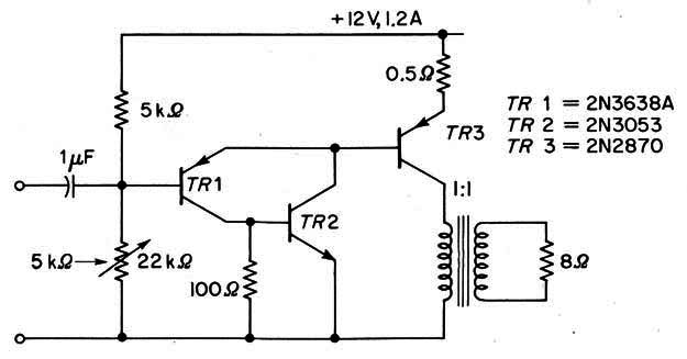Esta configuración utiliza tres transistores para acoplamiento directo y tiene una potencia de salida de 5 W en clase A . Este es un circuito convencional de una documentación 1968, pero los transistores pueden ser reemplazados por equivalentes modernos como a TIP32 salida.