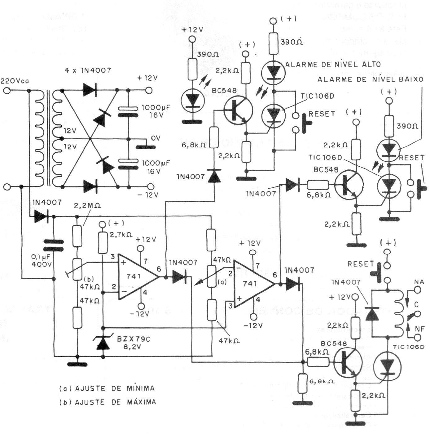 Este circuito tiene por objeto disparar una alarma cuando la tensión de entrada supera un valor y disparar otro cuando la tensión cae por debajo de otro valor pre ajustado. El circuito incluye la fuente de alimentación y hace uso de amplificadores operativos 741. Los SCR se pueden conectar a relés o directamente a los circuitos de aviso que deben activarse.