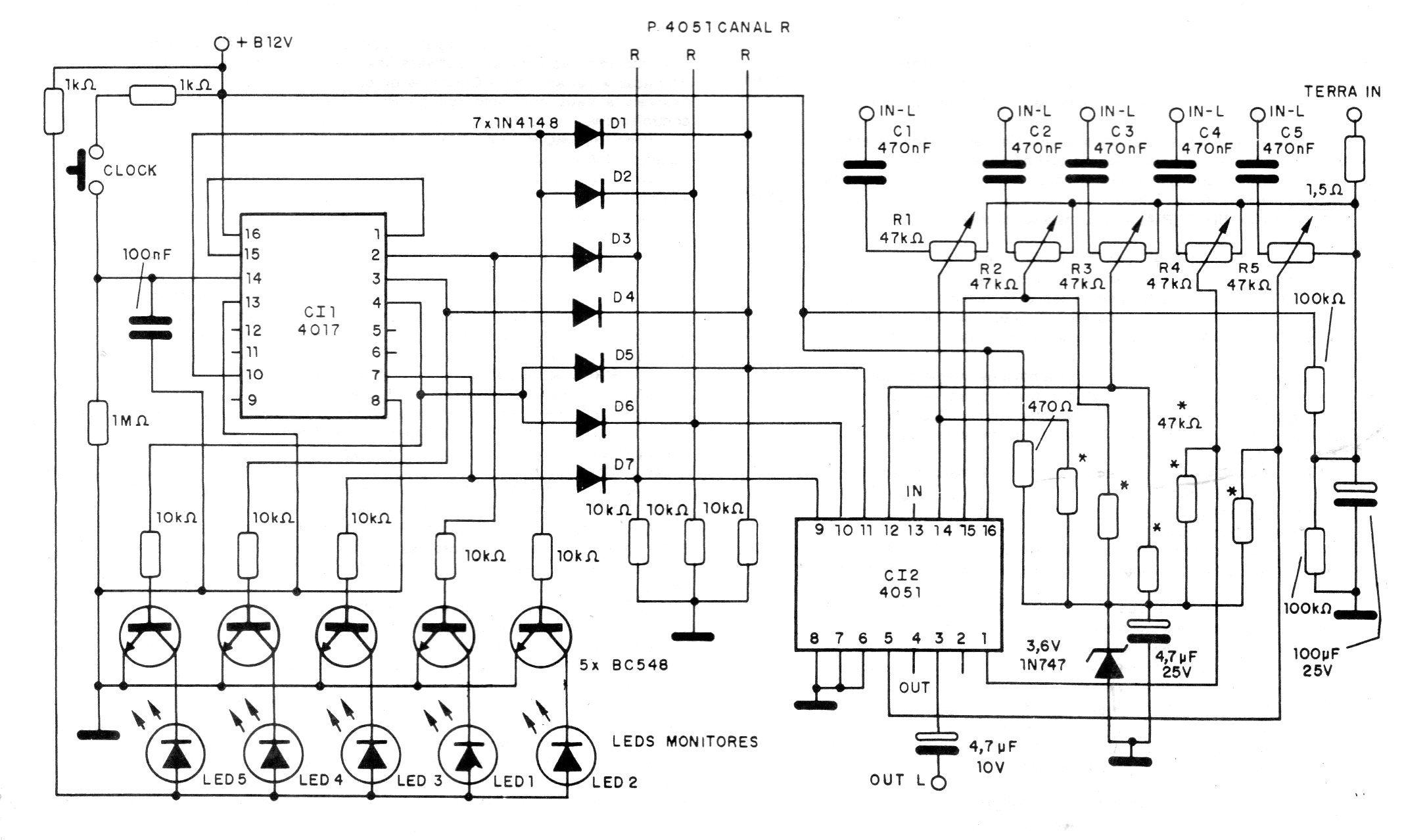 Este circuito fue obtenido en una publicación de 1994. Su finalidad es conmutar de modo digital 5 entradas de audio, aplicando la salida a la entrada de un amplificador u otro circuito. El circuito es alimentado por una tensión de 12 V y se basa en integrados CMOS conocidos y fáciles de obtener. Los cables de entrada y salida de señales deben ser blindados. Los potenciómetros controlan las intensidades de las señales.