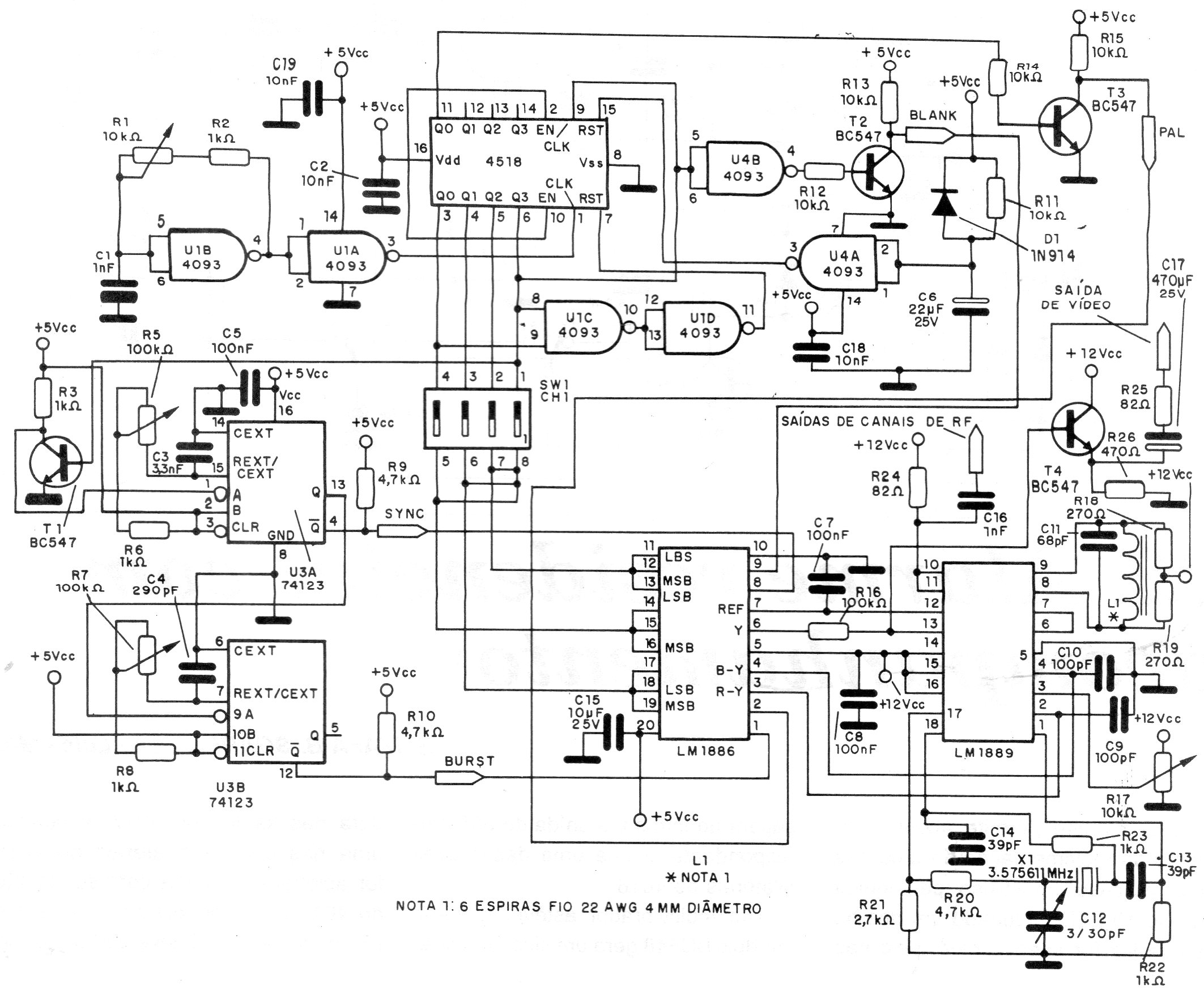 Este antiguo circuito es de la época de los televisores analógicos, sirviendo para los técnicos realizar ajustes de los circuitos de color, linealidad, convergencia y otros. El circuito todavía se puede montar, ya que la mayoría de los componentes usados todavía se pueden encontrar con facilidad. Los ajustes de las barras se realizan en trimpots y las señales obtenidas son RGB como modulación PAL-M. El circuito debe ser alimentado por fuente de 5 y 12 V.