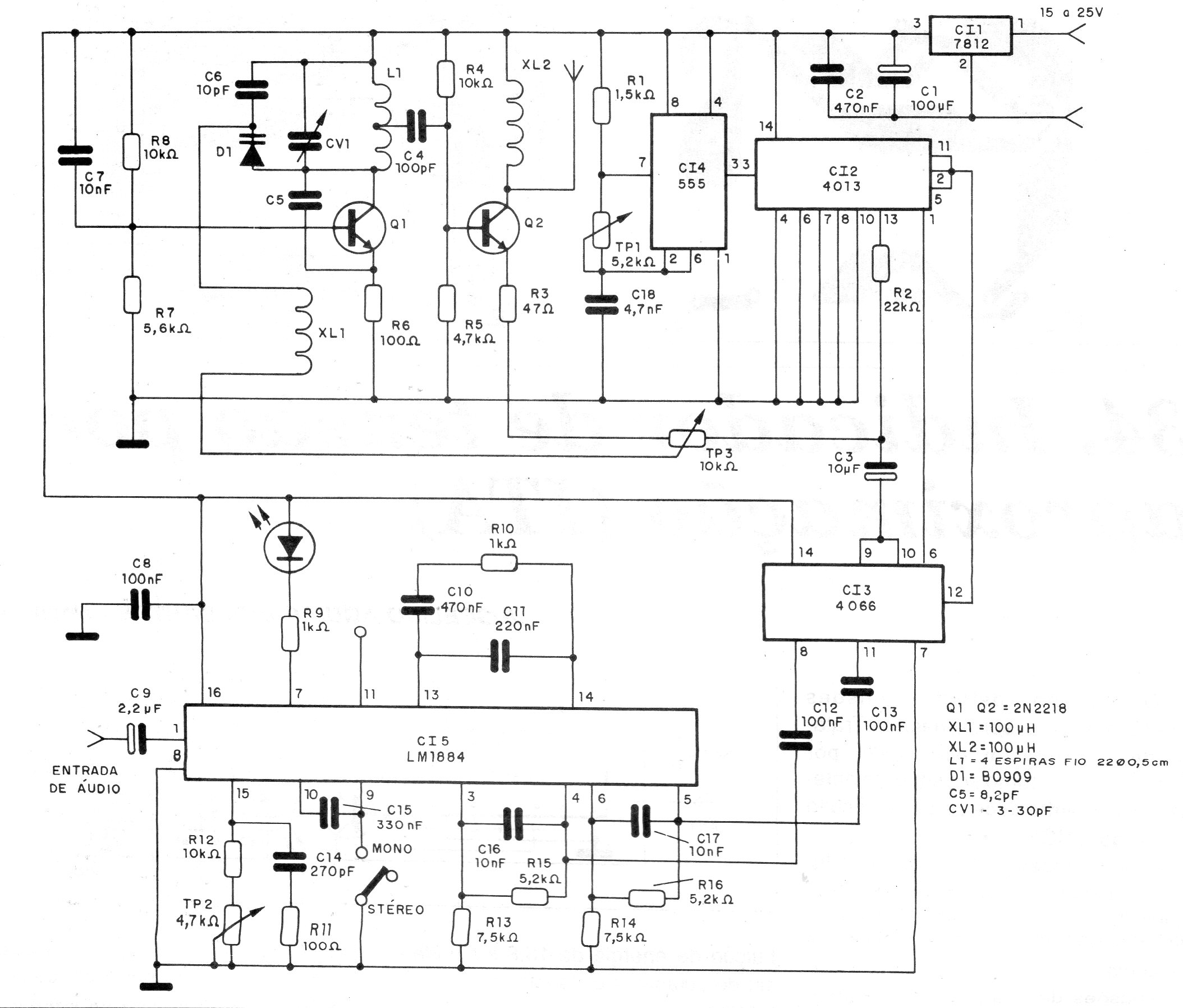 Este circuito es de una documentación de 1994, sirviendo para la transmisión de señales de la TV analógica que pronto estará en desuso. Sin embargo, se puede utilizar con cámaras antiguas en monitoreo y otras aplicaciones menos críticas. El circuito requiere una buena fuente y es crítico en cuanto a la posición de los elementos dada la operación con señales de frecuencias elevadas.