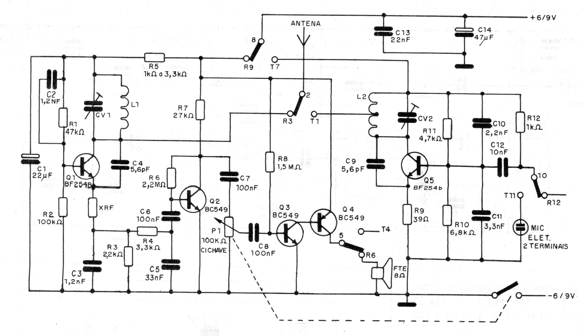 Este circuito que utiliza sólo transistores comunes puede operar entre 60 y 130 MHz, según las bobinas que se pueden cambiar fácilmente. El circuito tiene ajustes de frecuencia de recepción y transmisión hechos en los trimpots y utiliza micrófonos de electreto. El alcance puede llegar a 100 metros dependiendo de las condiciones de propagación del local. La antena es telescópica de 50 cm a 1 m de longitud. La alimentación se puede realizar con 6 o 9 V de pilas o batería.