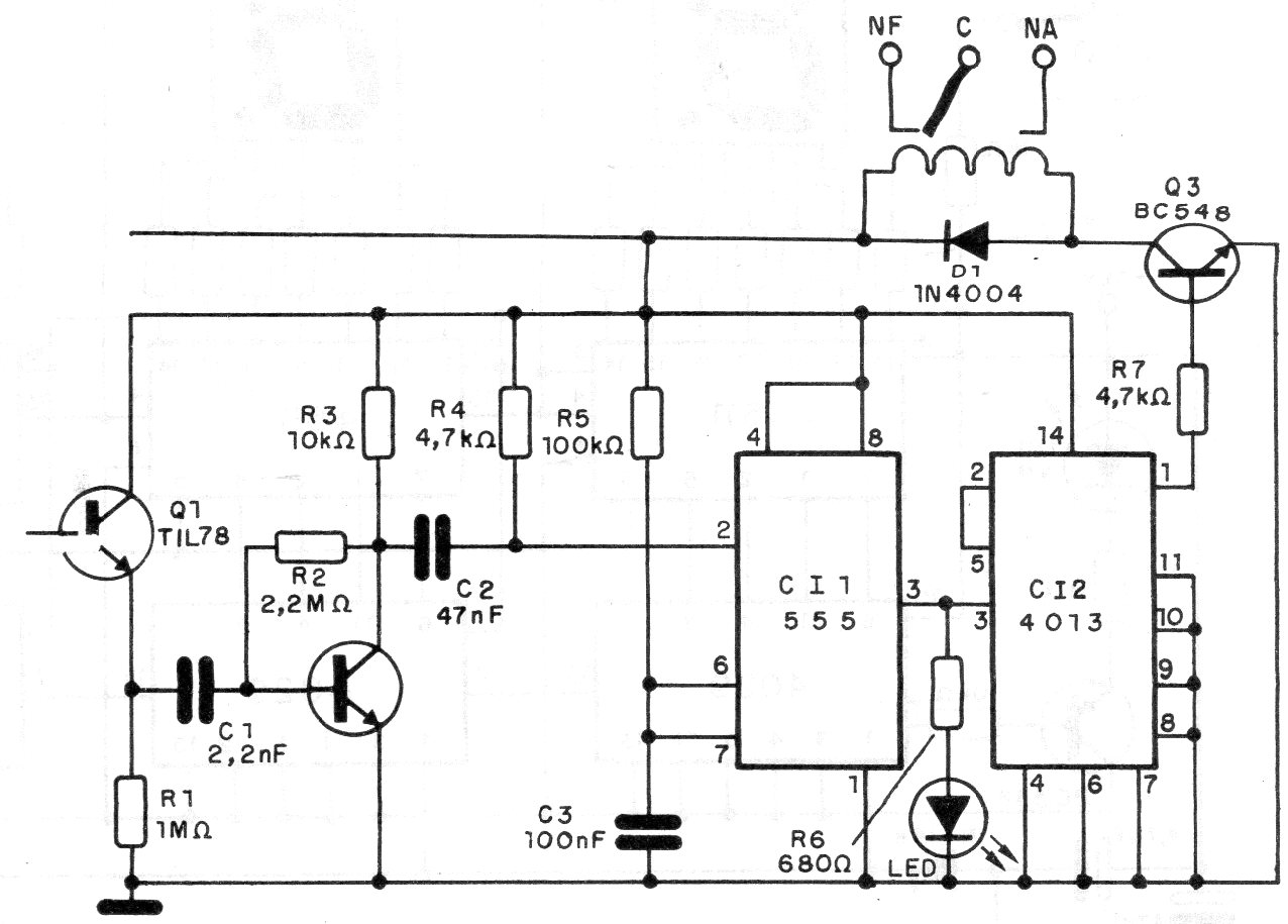 Este circuito, encontrado en una documentación de 1995, hace el control biestable de un relé a partir de pulsos de luz recibidos por el sensor. El sensor puede ser cualquier foto-transistor común. La alimentación se puede realizar con 6 ó 12 V según la tensión de relé utilizada. El sensor debe montarse en un tubo opaco con lente para mayor directividad. El transmisor se da en CIR7776S.