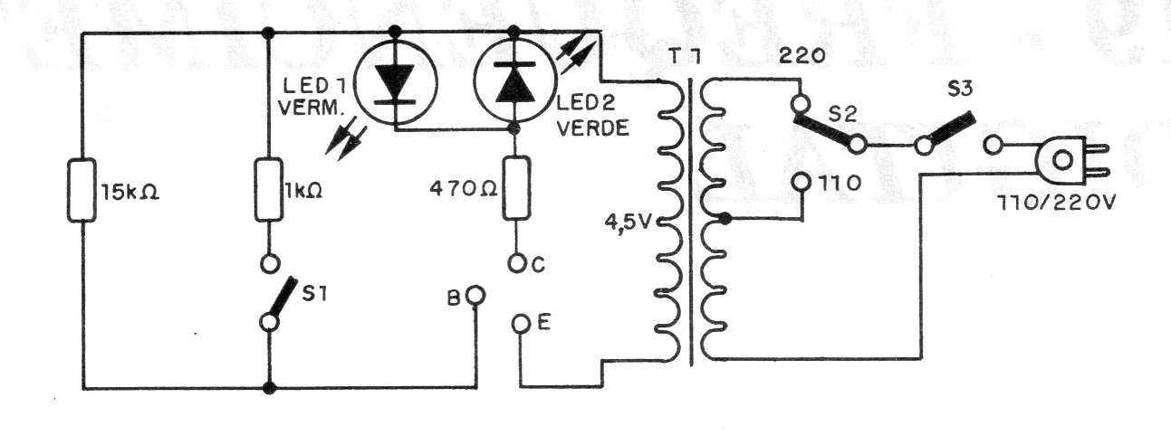 Este simple circuito permite probar diodos de uso general y rectificadores y también transistores de uso general, medio y de potencia. El circuito tiene dos LED que indican el estado del componente.