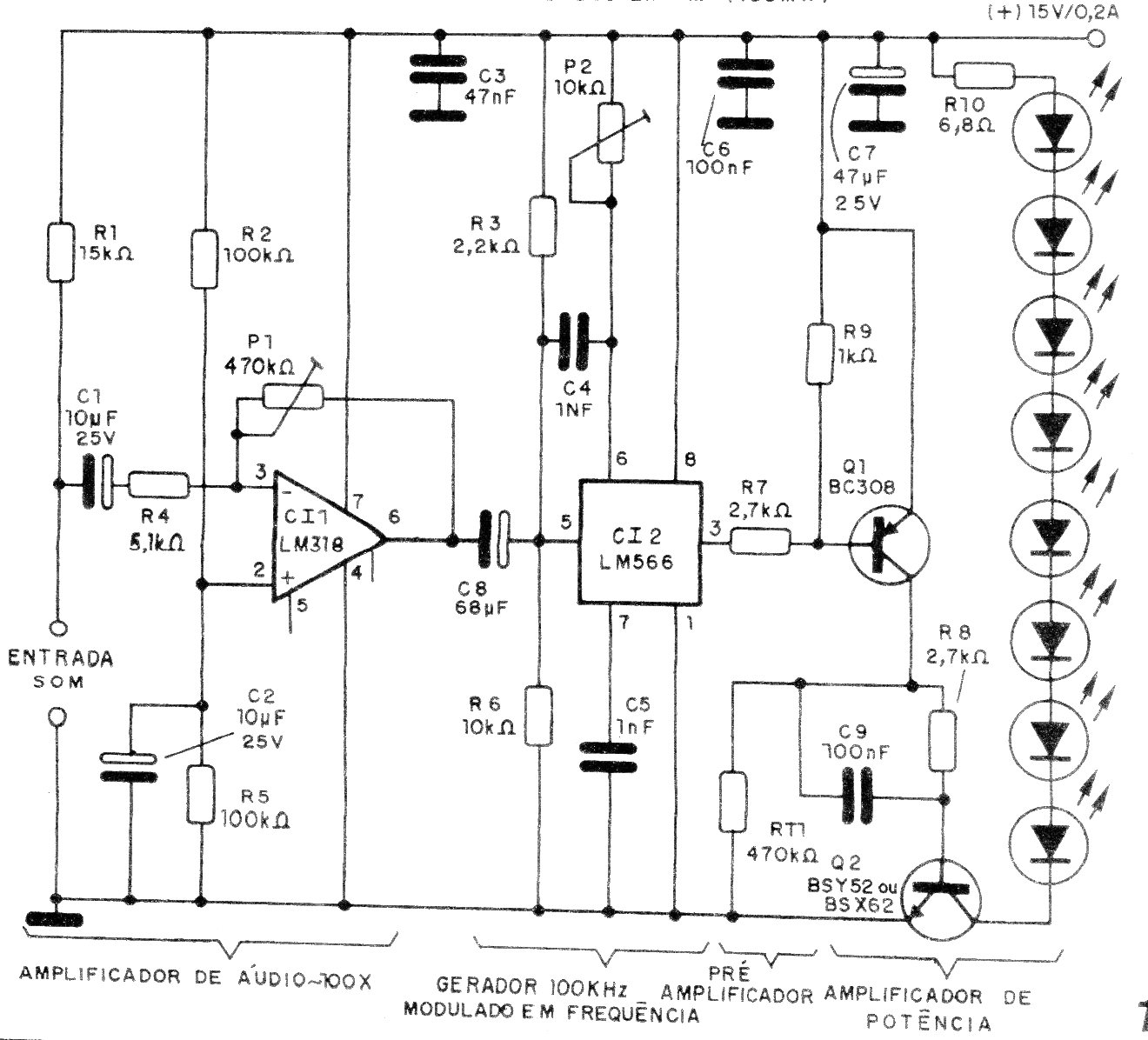 Encontramos este circuito en una publicación de 1995. Utiliza LED infrarrojos del tipo existente en la época que no tenían un rendimiento muy alto. Hoy, se puede obtener el mismo rendimiento con sólo dos LED, aumentando R10 a 22 ohms o incluso 47 ohms. El circuito tiene su ganancia ajustada en el trimpot y los LEDs deben ser dirigidos hacia el receptor que se da en CIR7771S. La alimentación es de 15 V, pero con LED de mayor rendimiento puede reducirse a 12 V.