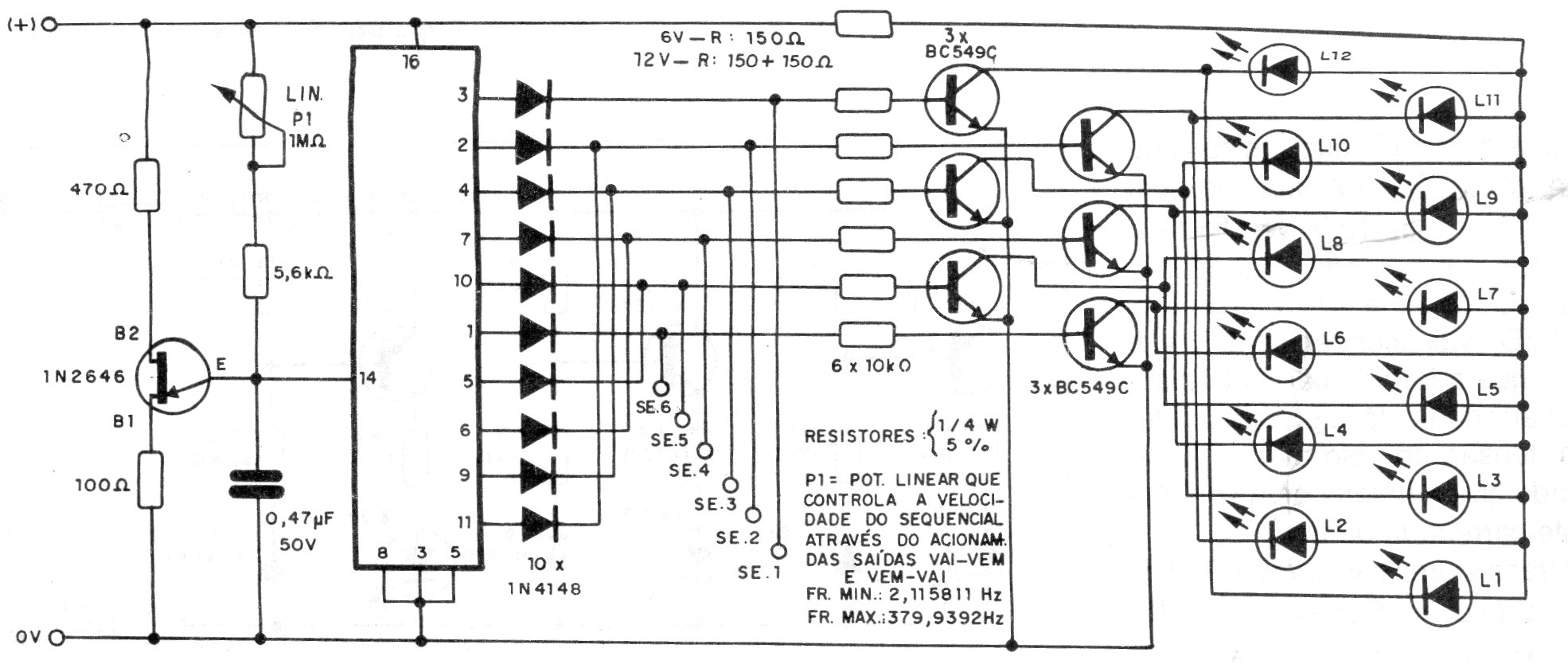 Este circuito utiliza componentes que aún son comunes, a pesar de ser de una documentación de 1995. El circuito puede ser alimentado por tensiones de 6 a 12 V y la velocidad del efecto de flujo de los LEDs se ajusta en P1.