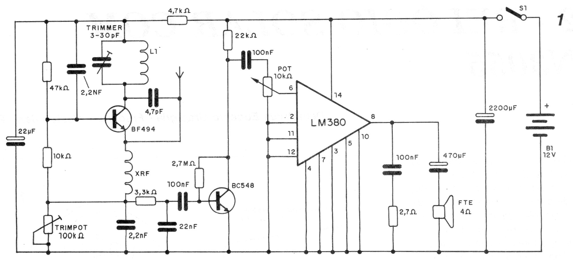 Este circuito de 1995 utiliza un amplificador de audio que ya no es común en nuestros días. Sin embargo, otros amplificadores pueden ser usados manteniendo la etapa super-regenerativa de entrada. L1 puede tener de 2 a 4 espiras de hilo 26 en forma de 1 cm sin núcleo, según el rango que se desea recibir de 80 a 150 MHz. XFR consiste en aproximadamente 50 vueltas de hilo 32 en un resistor de 100 k o mayor de ½ W.
