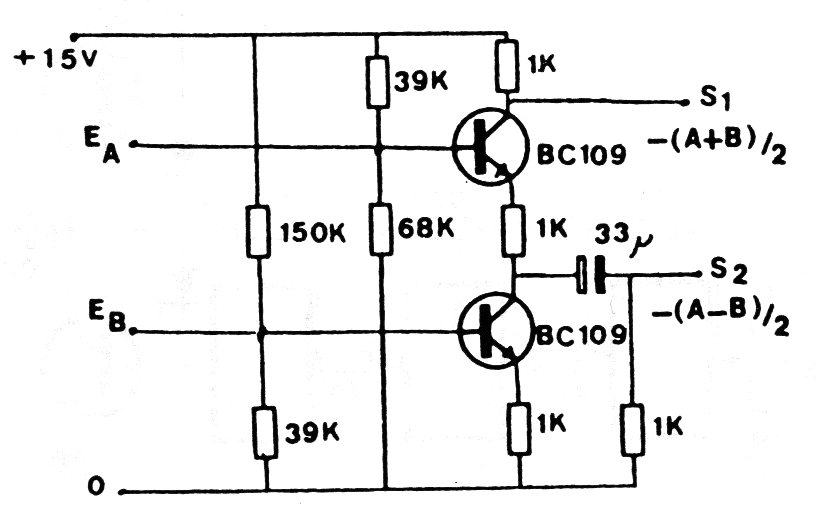 El circuito presentado utiliza transistores comunes que pueden ser los BC549.La amplitud máxima de las señales de entrada es de 1,4 V la tensión de una de las salidas será la suma de las tensiones de entrada y de la otra salida a la diferencia entre las tensiones de entrada.