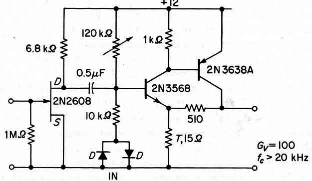Este circuito utiliza FETs de alta ganancia y una gama de paso de hasta 100 kHz. El circuito es de una documentación de 1968 pero puede ser montado con equivalentes modernos para los FETs. La impedancia de entrada es alta.