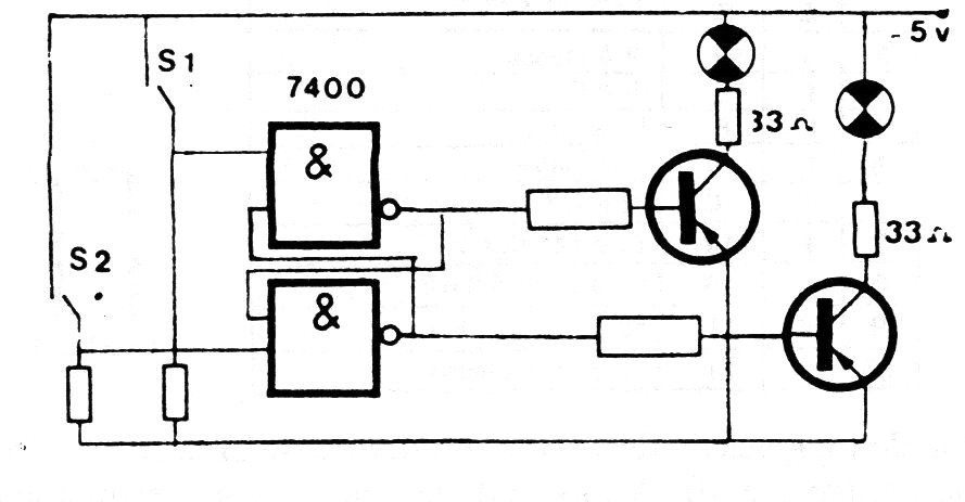 Este circuito fue sugerido por una antigua documentación francesa, pero puede ser usado como shield, en cuyo caso las señales de salidas de un microcontrolador serán usadas en lugar de S1 y S2. En lugar de las lámparas también se pueden utilizar LEDs u otras cargas y los transistores pueden los BC548. El circuito también se puede utilizar como escudo de entrada, en cuyo caso S1 y S2 serán sensores.