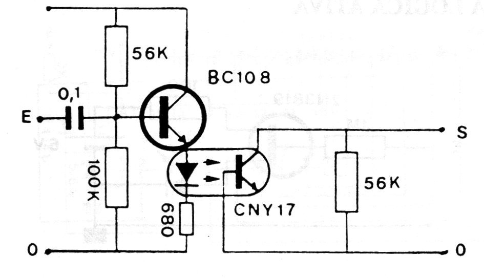 Este circuito es de una antigua documentación francesa de los años 70. El acoplador admite equivalentes y el transistor puede ser el BC548. El circuito puede ser usado en un enlace de audio donde se desee un gran aislamiento de la fuente emisora o del receptor.