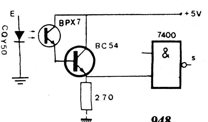 Este circuito se puede utilizar como clave óptica o foto-sensor para excitar la lógica TTL. El transistor puede ser el BC548 y cualquier foto-transistor se puede emplear. El circuito es de una antigua documentación francesa de los años 70.