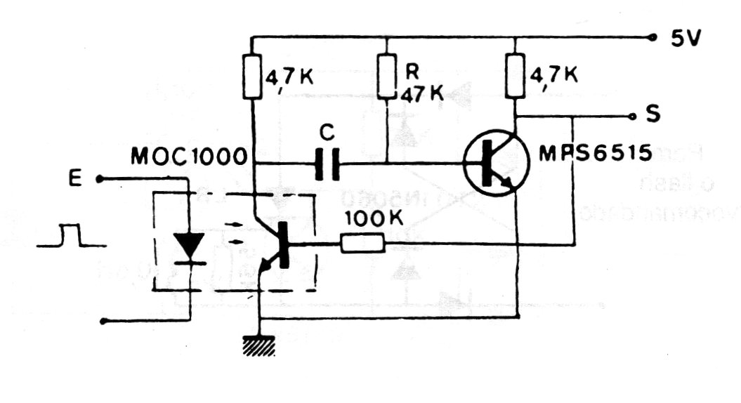 Una nueva configuración de escudo óptico monoestable se muestra a continuación. El tiempo en que la señal de salida está presente es determinada por el condensador C. El acoplador óptico admite equivalentes y en la excitación por un microcontrolador debe preverse un resistor de 120 a 330 ohms en serie con la salida. El circuito es de una antigua documentación francesa. El transistor puede ser el 2N2222.