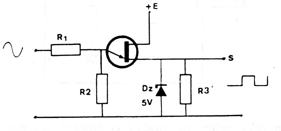 Este circuito produce señales rectangulares a partir de una entrada senoidal. El circuito utiliza un transistor unijuntura y su alimentación puede ser hecha con tensiones a partir de 5 V conforme la tensión de entrada. La salida se fija en 5 V por el zener lo que permite el uso del circuito en un shield de entrada para microcontroladores.