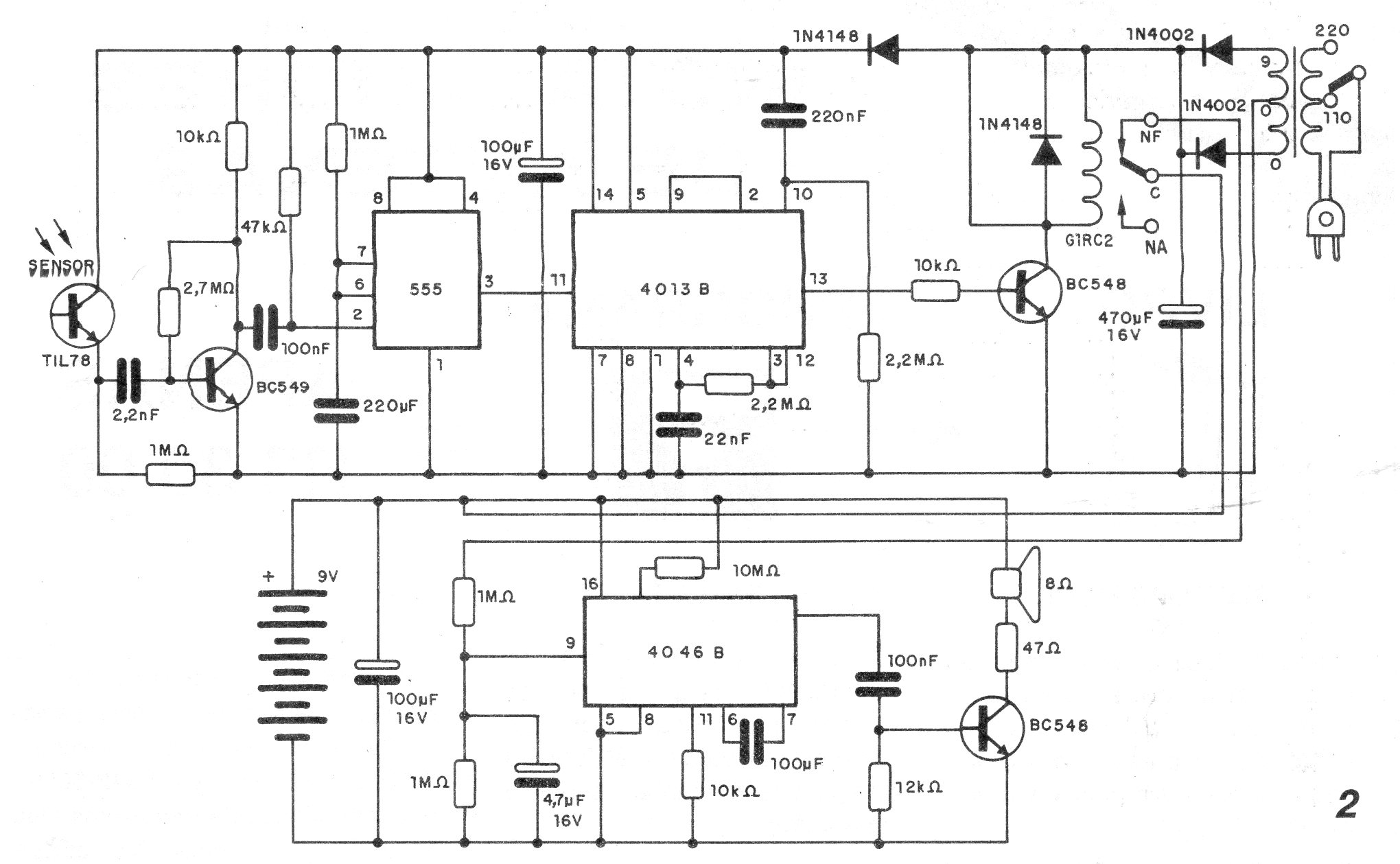 Este circuito con sensor de paso óptico se encontró en una documentación de 1995. El circuito se dispara cuando, por un momento, deja de incidir la luz en el foto-transistor. El circuito tiene una acción bautismal dada por el 4013 y el control es hecho por un relé. El circuito incluye una batería que alimenta el circuito en caso de corte de energía y una sirena con un PLL 4046. El transmisor puede ser uno de los circuitos de LED modulados en tono que tenemos en esta sección.