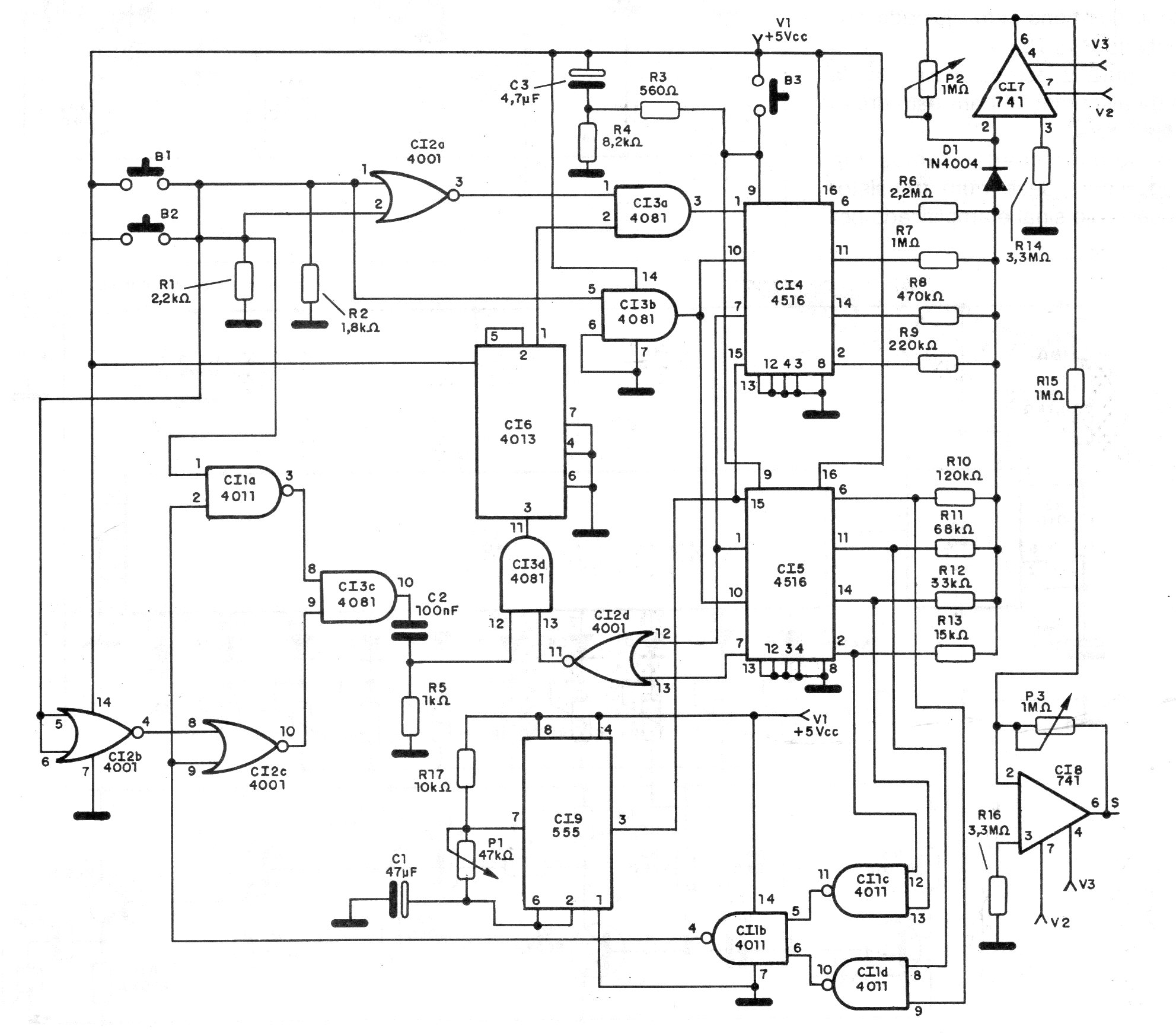 Si bien existen versiones integradas modernas, este circuito de 1995, muestra una solución discreta con circuitos integrados comunes para un potenciómetro electrónico. El circuito utiliza integrados CMOS y debe utilizar dos fuentes de alimentación, ya que es necesaria una tensión negativa para los operacionales. Así, V1 es de 5 V y V2, V3 dependen del operativo y de la señal quedando entre 6-0-6 y 12-0-12 V.