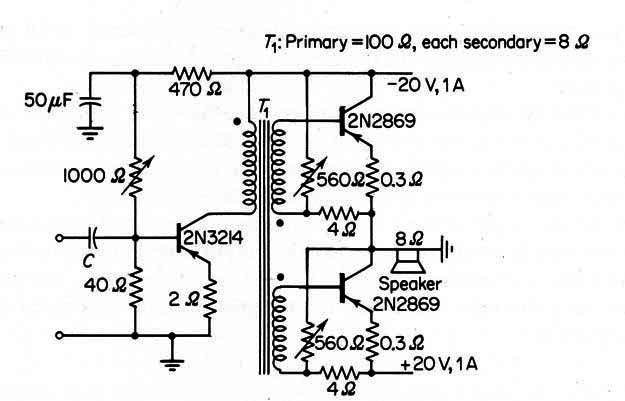 Este circuito utiliza dos transistores de potencia en una configuración con transformador, proporcionando una potencia de 15 W. El circuito es 1968, pero puede ser hecho con componentes modernos, sólo tener dificultades para obtener transformador. Tenga en cuenta la importancia de conectar correctamente el transformador basado en la dirección de los devanados.