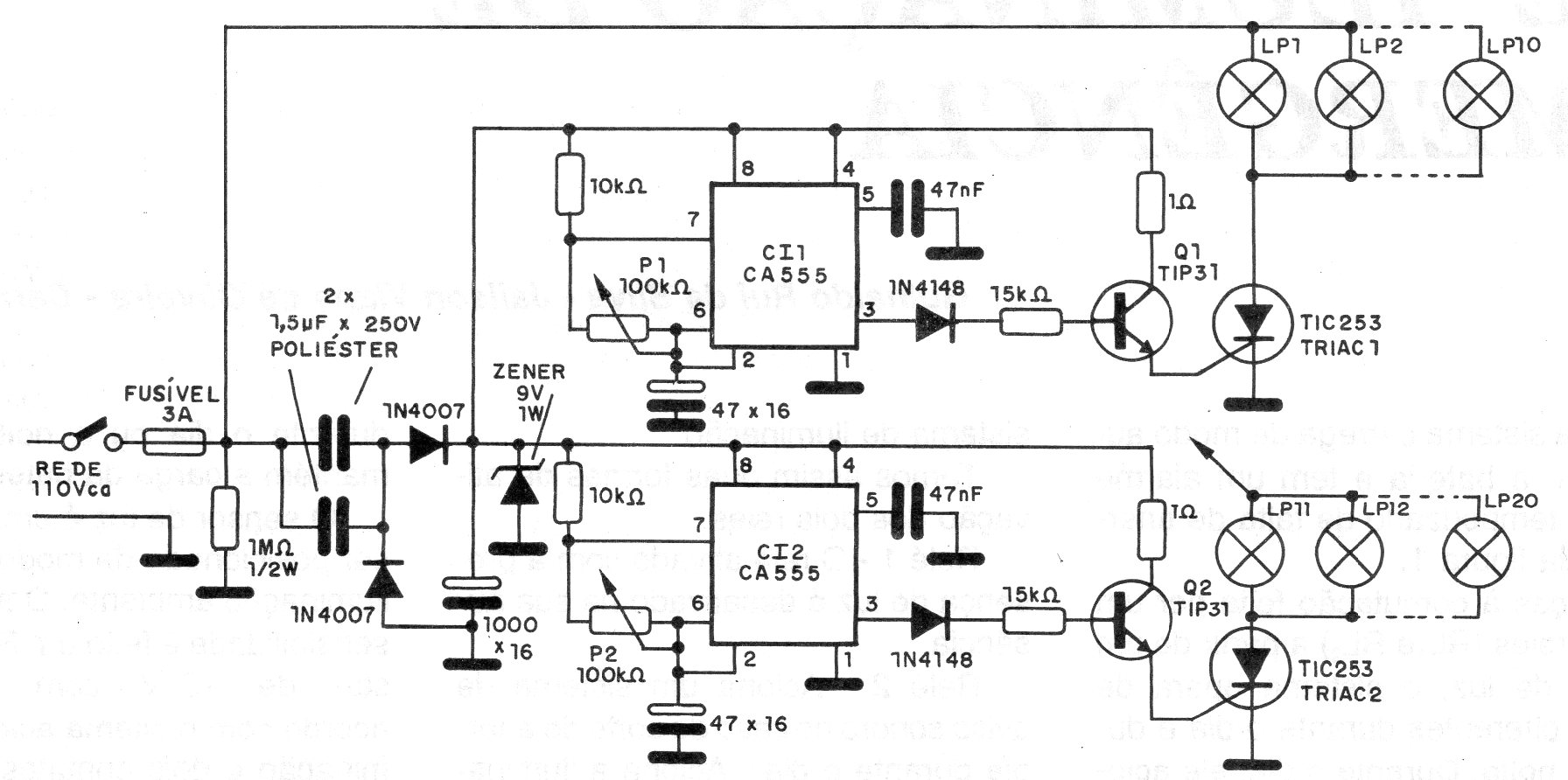 Este circuito, de una publicación de 1995, alimenta lámparas incandescentes conforme a la red de energía. El circuito utiliza SCRs que deben estar dotados de buenos disipadores de calor. Las dos secuencias de lámparas parpadean a diferentes velocidades determinadas por los ajustes de los potenciómetros.