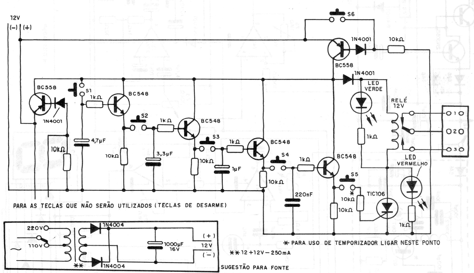 Sólo cuando la secuencia de llaves programadas es accionada, y en un tiempo mínimo determinado por los capacitores, es que el relé es activado liberando una cerradura u otro dispositivo. El circuito incluye la fuente de alimentación de acuerdo con el relé utilizado. Encontramos este circuito en una documentación de 1995.
