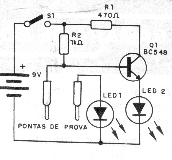 Encontramos este circuito probador de continuidad simple en una documentación de 1995. Utiliza dos LED para dar la indicación de continuidad y es alimentado por sólo dos pilas comunes.