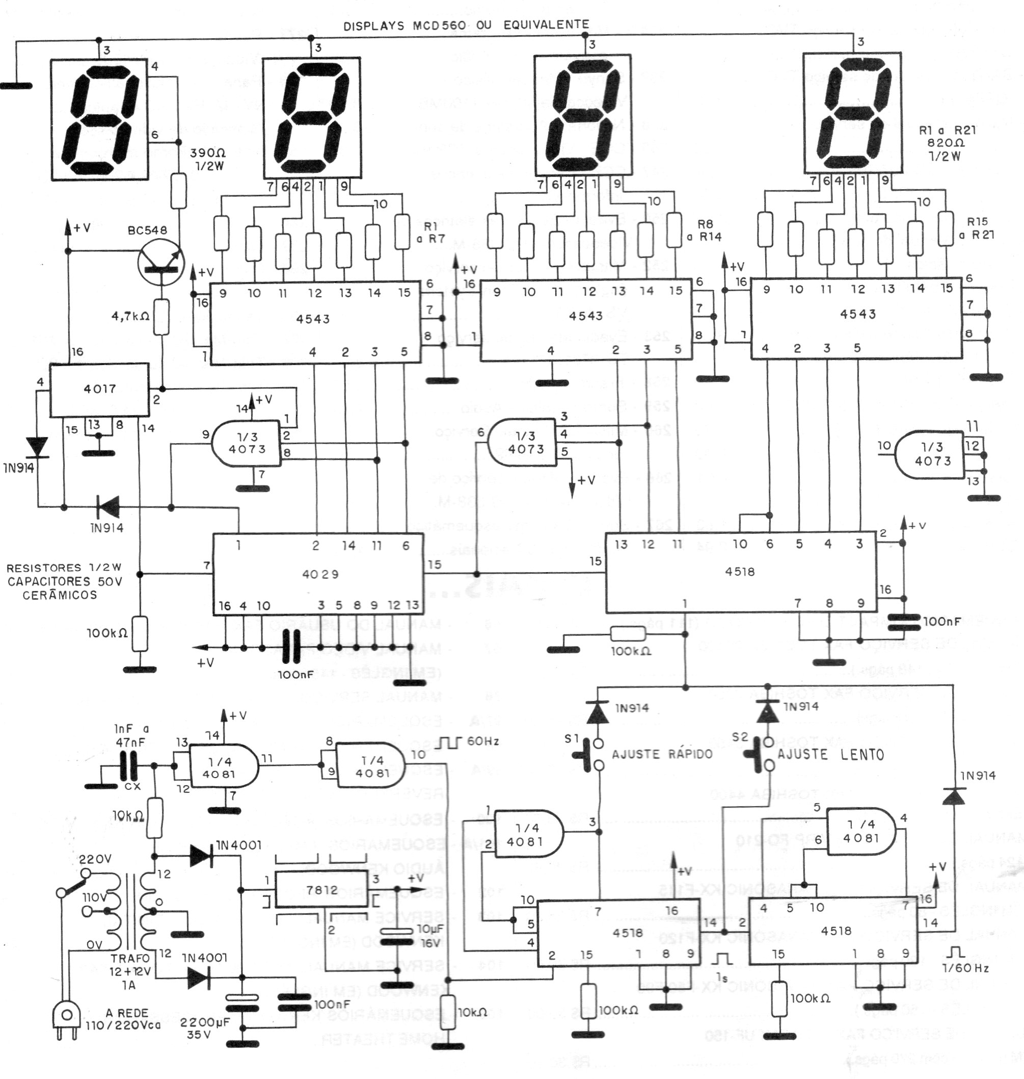 Este reloj digital de 4 dígitos para horas y minutos con circuitos integrados CMOS fue encontrado en una documentación de 1995. El circuito es muy preciso, ya que utiliza la frecuencia de la red de energía como base de tiempo. Los displays son de cátodo común y él tiene aciertos lento y rápido para mayor facilidad de uso.