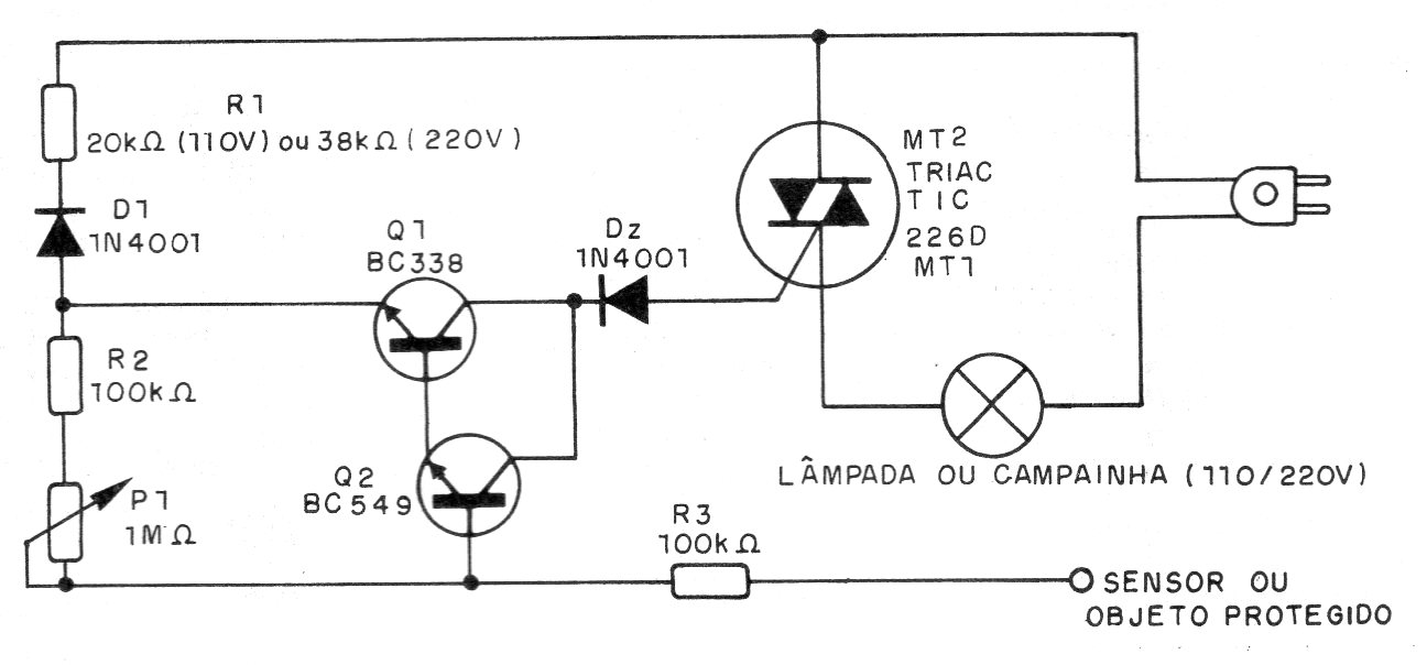 Esta simple alarma de tacto o toque, que se encuentra en una documentación de 1995, utiliza componentes comunes y un triac para accionar una lámpara u otro tipo de carga. Conforme a la corriente de la carga, el triac debe estar dotado de un disipador de calor. El ajuste de la sensibilidad se realiza a través de P1. Si el circuito no funciona invierte la fase de alimentación.