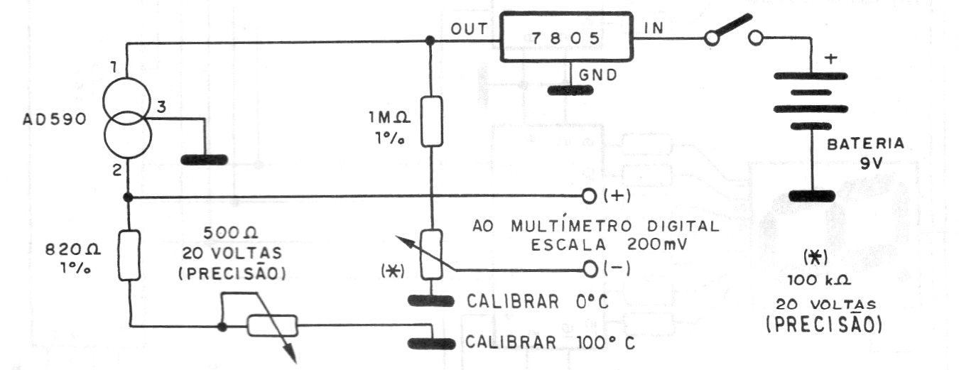 Este circuito permite utilizar un multímetro digital como termómetro. El sensor se monta dentro de un embalaje blindado. El ajuste es hecho por un trimpot de precisión multivoltas. El circuito integrado sensor no es un componente fácil de obtener actualmente.