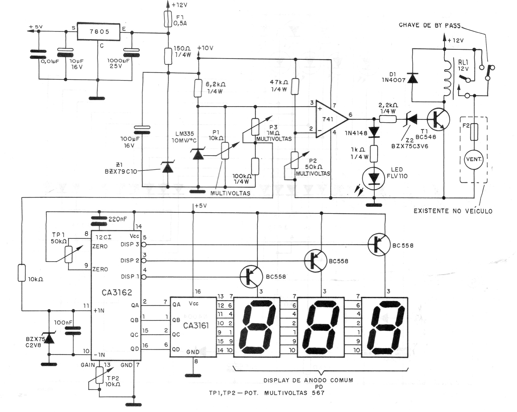 Originalmente este circuito fue diseñado para monitorear la temperatura de un vehículo. Los circuitos integrados de accionamiento de los displays no son muy comunes actualmente. Los ajustes del circuito que corresponden a la escala y la temperatura se realizan a través de trimpots. El circuito es alimentado por una tensión de 12 V con un regulador de 5 V.