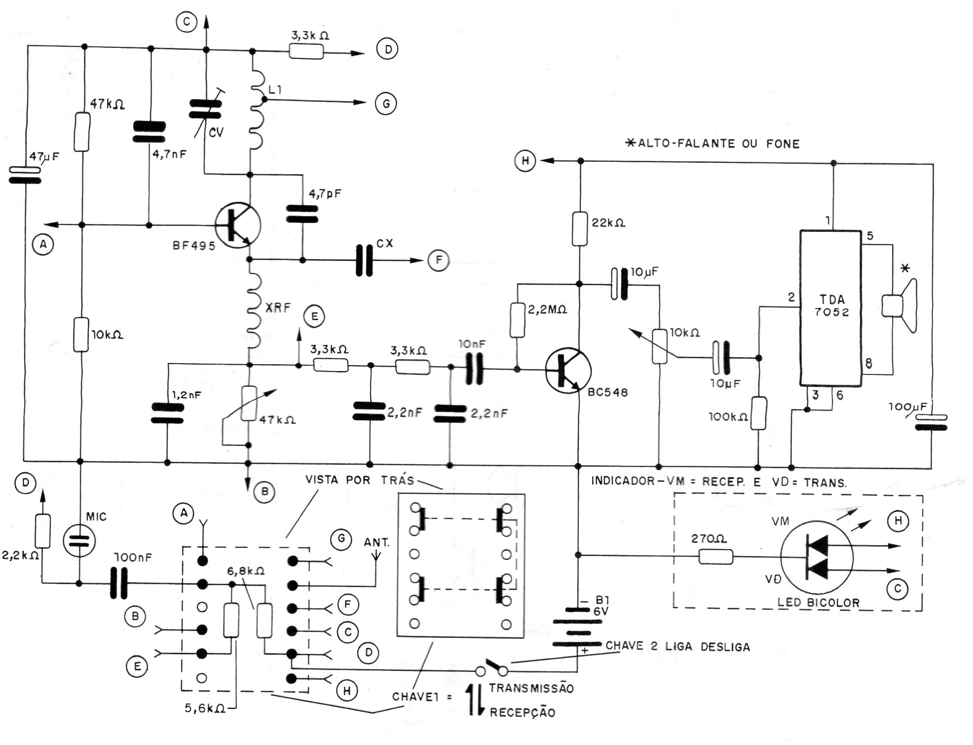 El alcance de este transceptor puede sobrepasar los 100 metros dependiendo de las condiciones del lugar de uso. L1 tiene 3 espiras de hilo rígido en forma de 1 cm. El trimmer es de 3-30 pF o 2-20 pF. XRF está formado por 50 espiras de hilo fino en un resistor de 100 k. Cx puede ser formado por dos pedazos de hilo de 3 con enlazados. El circuito se alimenta con una batería de 9 V.