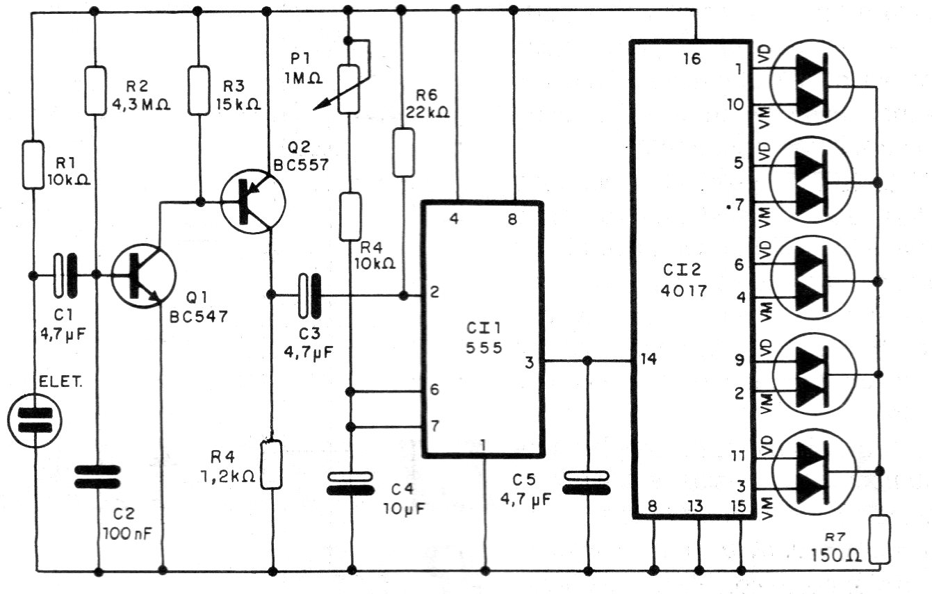 Este circuito fue encontrado en una documentación de 1995. Acciona un conjunto de LEDs secuenciales a partir del sonido captado por un micrófono de electreto. El sonido modula el flujo de los LED en un efecto que se ajusta por P1. El circuito es alimentado por el pin 16 del 4017 y la línea para las demás etapas con tensiones de 6 a 12 V.