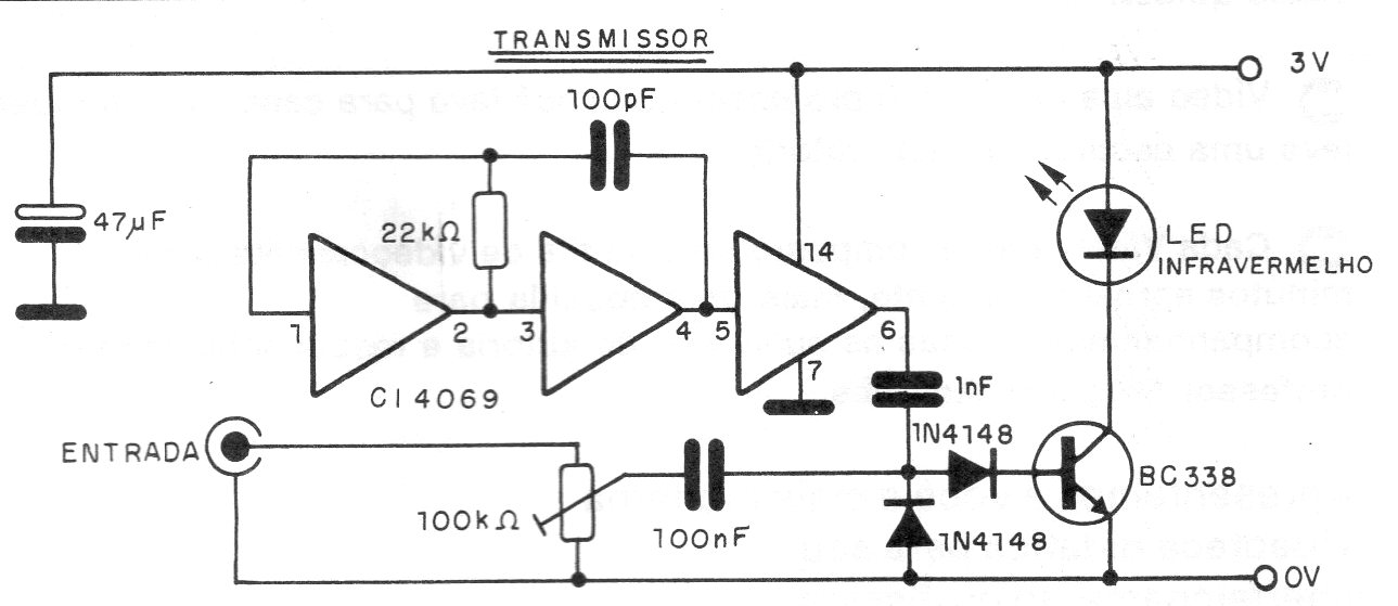 Este circuito sirve de base para un enlace de audio por infrarrojo, usando un sonido remoto para auriculares inalámbricos. El circuito tiene un buen alcance si el emisor se instala en un tubo opaco con una lente. El circuito es alimentado por una tensión de sólo 3 V, pero puede ser alimentado con 6 V si se utiliza LED emisor de mayor potencia.