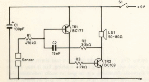 Encontramos este circuito en una publicación inglesa de 1979. El circuito se puede montar con componentes más modernos como el BC557 para TR1 y BC548 para TR2. La tensión de alimentación puede oscilar entre 6 y 12 V y el circuito también funcionará con los altavoces de impedancia más bajos.