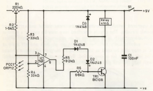Encontramos este circuito en una documentación inglesa de 1979. El circuito puede ser implementado con un BC548 en lugar del transistor original y el sensor es un LDR común. Los relés de 6 o 12 V con corriente de bobina de hasta 100 mA se pueden utilizar si la tensión de alimentación está debidamente alterada.