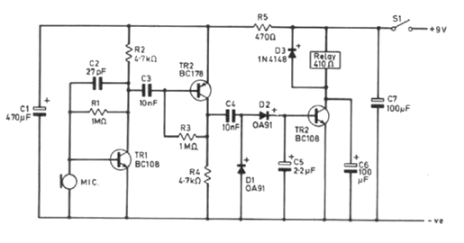 Este circuito es el receptor para el transmisor mostrado en CIR7040. El relé puede ser de 50 a 100 mA con alimentación de 6 o 12 V, según el ocaso. Los transistores pueden ser equivalentes modernos como los BC548 para el BC108 y BC558 para el BC178. El sensor debe ser del tipo ultrasónico de alta impedancia.
