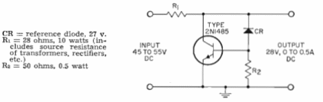 Encontramos esta configuración de regulador paralelo en el manual de transistores de la RCA de 1964. El circuito puede ser implementado con transistores modernos como los TIP31C o TIP41C.