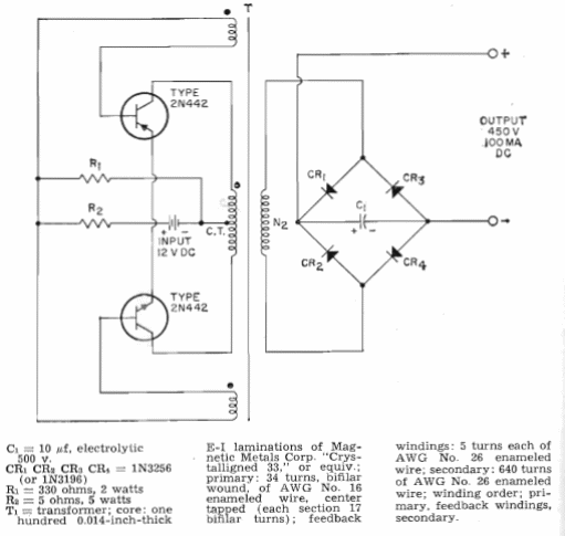 El componente crítico de este circuito, encontrado en el manual de transistores RCA de 1964, es el transformador. Los transistores pueden ser los TIP42. La tensión de salida depende del transformador que debe ser enrollado por el ensamblador.