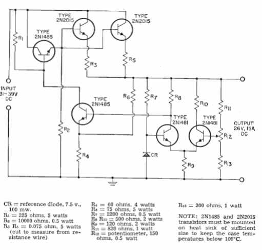 Este regulador fue encontrado en el manual de transistores de la RCA de 1964. Los transistores de potencia pueden ser los 2N3055 y la tensión de salida es determinada por el diodo zener y el ajuste de R12. Los demás transistores también admiten equivalentes.