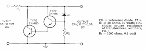 Encontramos este circuito en el manual de transistores de la RCA de 1964. El transistor 2N1485 admite equivalente así como el otro. El diodo zener determina la tensión de salida.