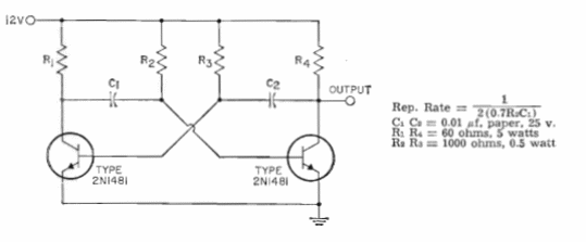 Encontramos este circuito tradicional de multivibrador en el manual de transistores de la RCA de 1964. Los transistores admiten equivalentes como los BC548 y la frecuencia puede ser alterada, conforme fórmula dada junto al diagrama.