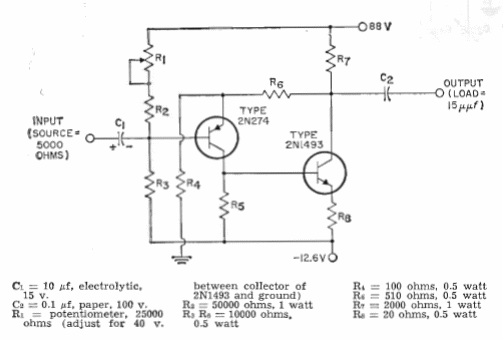 Este amplificador con ganancia 75 fue encontrado en el manual de transistores de la RCA de 1964. La impedancia es elevada y los transistores utilizados no son más comunes en nuestro mercado y deben ser buscados equivalentes.