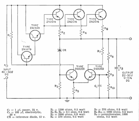 Encontramos este circuito en el manual de transistores de la RCA de 1964. Los transistores son poco comunes actualmente, pero para los transistores de potencia se pueden utilizar los 2N3055. Para el 2N4889 se puede utilizar el TIP31 y los demás pueden ser BD135.