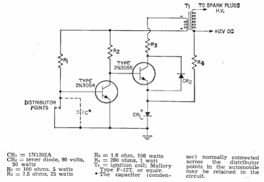 Encontramos este circuito de encendido de 12 V en el manual de transistores de la RCA de 1964. El 2N3054 puede ser sustituido por el TIP41C. Los dos transistores deben estar dotados de disipadores de calor.